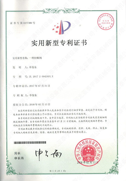 拉斷閥專利證書